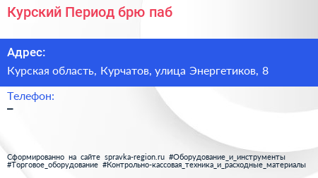 Курский Период, брю-паб по адресу Курская область, Курчатов, улица Энергетиков, 8 в дальнейшем Организация, размещена в следующих категориях: