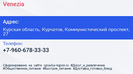 Venezia по адресу Курская область, Курчатов, Коммунистический проспект, 27 в дальнейшем Организация, размещена в следующих категориях: