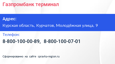 Газпромбанк, терминал по адресу Курская область, Курчатов, Молодёжная улица, 9 в дальнейшем Организация, размещена в следующих категориях: