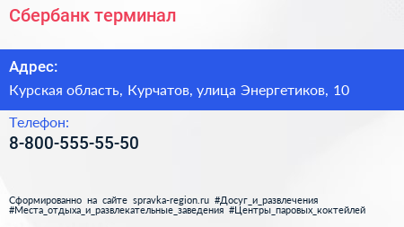 Сбербанк, терминал по адресу Курская область, Курчатов, улица Энергетиков, 10 в дальнейшем Организация, размещена в следующих категориях:
