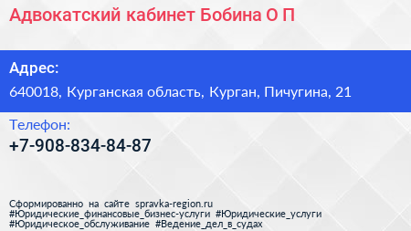 Адвокатский кабинет Бобина О.П. по адресу 640018, Курганская область, Курган, Пичугина, 21 в дальнейшем Организация, размещена в следующих категориях: