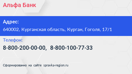 Альфа-Банк по адресу 640002, Курганская область, Курган, Гоголя, 17/1 в дальнейшем Организация, размещена в следующих категориях: