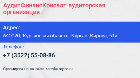 АудитФинансКонсалт, аудиторская организация по адресу 640020, Курганская область, Курган, Кирова, 51а в дальнейшем Организация, размещена в следующих категориях: