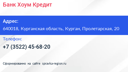Банк Хоум Кредит по адресу 640018, Курганская область, Курган, Пролетарская, 20 в дальнейшем Организация, размещена в следующих категориях: