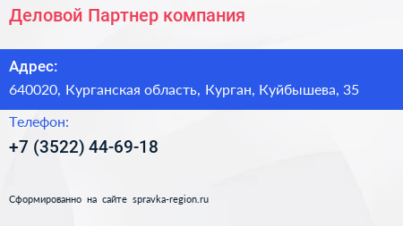 Деловой Партнер, компания по адресу 640020, Курганская область, Курган, Куйбышева, 35 в дальнейшем Организация, размещена в следующих категориях: