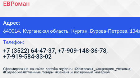 ЕВРоман по адресу 640014, Курганская область, Курган, Бурова-Петрова, 134а в дальнейшем Организация, размещена в следующих категориях: