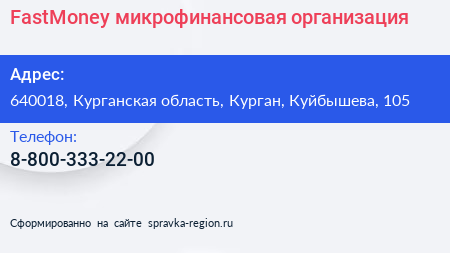 FastMoney, микрофинансовая организация по адресу 640018, Курганская область, Курган, Куйбышева, 105 в дальнейшем Организация, размещена в следующих категориях: