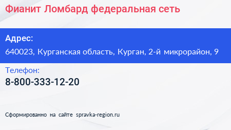 Фианит-Ломбард, федеральная сеть по адресу 640023, Курганская область, Курган, 2-й микрорайон, 9 в дальнейшем Организация, размещена в следующих категориях: