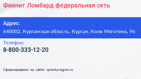 Фианит-Ломбард, федеральная сеть по адресу 640002, Курганская область, Курган, Коли Мяготина, 96 в дальнейшем Организация, размещена в следующих категориях: