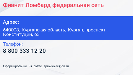 Фианит-Ломбард, федеральная сеть по адресу 640008, Курганская область, Курган, проспект Конституции, 63 в дальнейшем Организация, размещена в следующих категориях:
