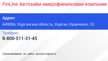 FinLine-Автозайм, микрофинансовая компания по адресу 640006, Курганская область, Курган, Кравченко, 55 в дальнейшем Организация, размещена в следующих категориях:
