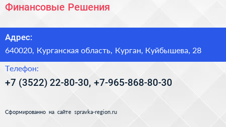 Финансовые Решения по адресу 640020, Курганская область, Курган, Куйбышева, 28 в дальнейшем Организация, размещена в следующих категориях: