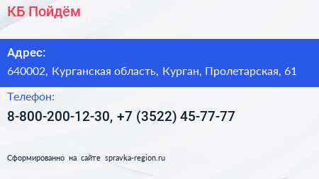 КБ Пойдём! по адресу 640002, Курганская область, Курган, Пролетарская, 61 в дальнейшем Организация, размещена в следующих категориях:
