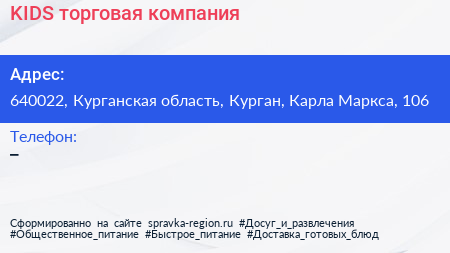 KIDS, торговая компания по адресу 640022, Курганская область, Курган, Карла Маркса, 106 в дальнейшем Организация, размещена в следующих категориях: