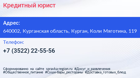 Кредитный юрист по адресу 640002, Курганская область, Курган, Коли Мяготина, 119 в дальнейшем Организация, размещена в следующих категориях: