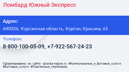 Ломбард Южный Экспресс по адресу 640026, Курганская область, Курган, Красина, 61 в дальнейшем Организация, размещена в следующих категориях: