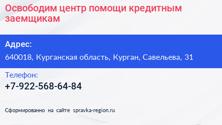 Освободим, центр помощи кредитным заемщикам по адресу 640018, Курганская область, Курган, Савельева, 31 в дальнейшем Организация, размещена в следующих категориях: