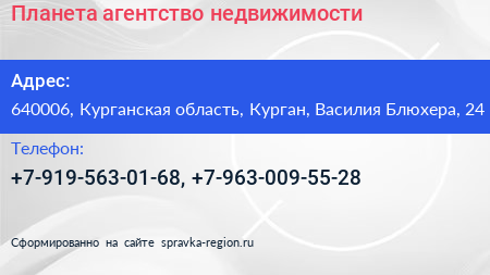 Планета, агентство недвижимости по адресу 640006, Курганская область, Курган, Василия Блюхера, 24 в дальнейшем Организация, размещена в следующих категориях: