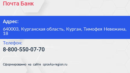 Почта Банк по адресу 640003, Курганская область, Курган, Тимофея Невежина, 18 в дальнейшем Организация, размещена в следующих категориях: