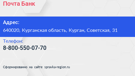Почта Банк по адресу 640020, Курганская область, Курган, Советская, 31 в дальнейшем Организация, размещена в следующих категориях: