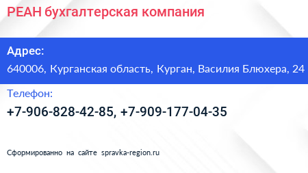 РЕАН, бухгалтерская компания по адресу 640006, Курганская область, Курган, Василия Блюхера, 24 в дальнейшем Организация, размещена в следующих категориях:
