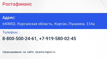Ростафинанс по адресу 640002, Курганская область, Курган, Пушкина, 114а в дальнейшем Организация, размещена в следующих категориях: