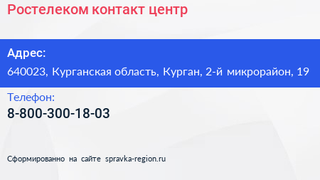 Ростелеком, контакт-центр по адресу 640023, Курганская область, Курган, 2-й микрорайон, 19 в дальнейшем Организация, размещена в следующих категориях: