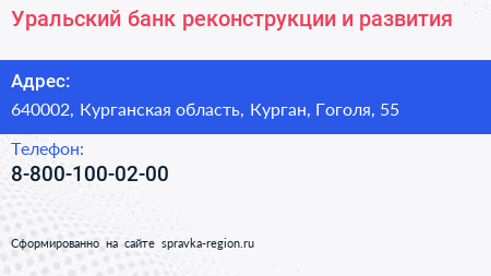 Уральский банк реконструкции и развития по адресу 640002, Курганская область, Курган, Гоголя, 55 в дальнейшем Организация, размещена в следующих категориях: