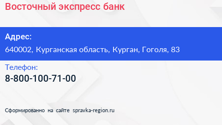 Восточный экспресс банк по адресу 640002, Курганская область, Курган, Гоголя, 83 в дальнейшем Организация, размещена в следующих категориях: