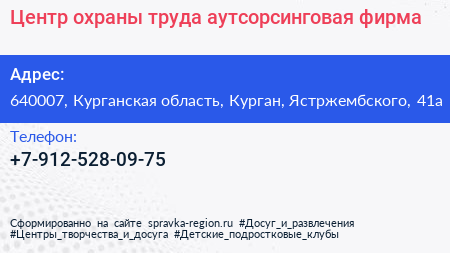 Центр охраны труда, аутсорсинговая фирма по адресу 640007, Курганская область, Курган, Ястржембского, 41а в дальнейшем Организация, размещена в следующих категориях: