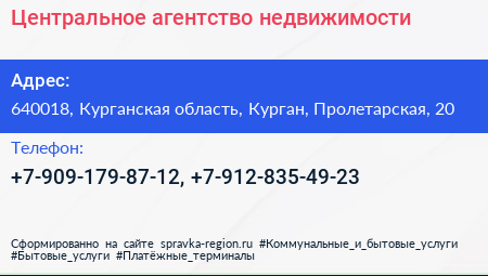 Центральное, агентство недвижимости по адресу 640018, Курганская область, Курган, Пролетарская, 20 в дальнейшем Организация, размещена в следующих категориях: