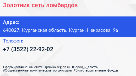 Золотник, сеть ломбардов по адресу 640027, Курганская область, Курган, Некрасова, 9а в дальнейшем Организация, размещена в следующих категориях: