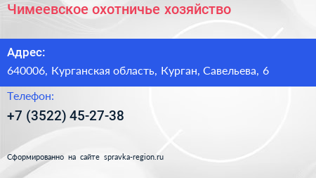 Чимеевское, охотничье хозяйство по адресу 640006, Курганская область, Курган, Савельева, 6 в дальнейшем Организация, размещена в следующих категориях: