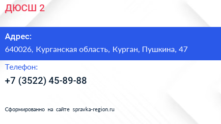 ДЮСШ №2 по адресу 640026, Курганская область, Курган, Пушкина, 47 в дальнейшем Организация, размещена в следующих категориях: