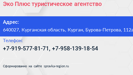 Эко Плюс, туристическое агентство по адресу 640027, Курганская область, Курган, Бурова-Петрова, 112а в дальнейшем Организация, размещена в следующих категориях: