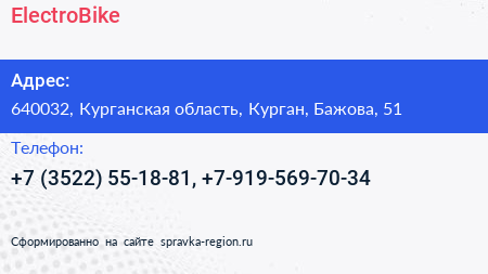 ElectroBike по адресу 640032, Курганская область, Курган, Бажова, 51 в дальнейшем Организация, размещена в следующих категориях:
