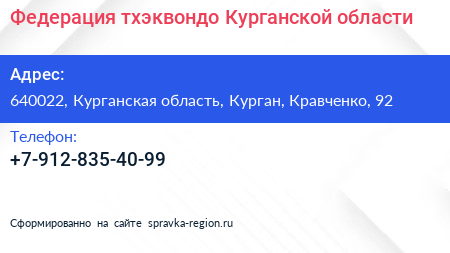 Федерация тхэквондо Курганской области по адресу 640022, Курганская область, Курган, Кравченко, 92 в дальнейшем Организация, размещена в следующих категориях: