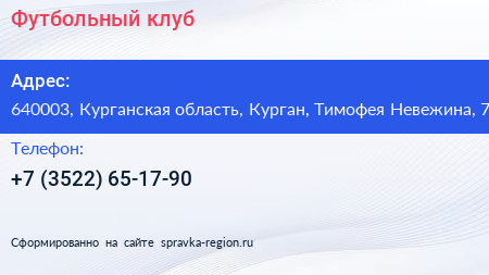Футбольный клуб по адресу 640003, Курганская область, Курган, Тимофея Невежина, 7 в дальнейшем Организация, размещена в следующих категориях: