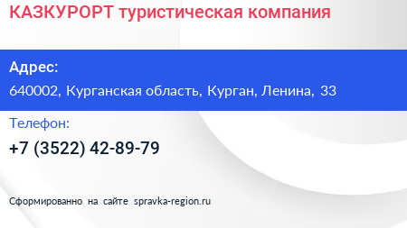 КАЗКУРОРТ, туристическая компания по адресу 640002, Курганская область, Курган, Ленина, 33 в дальнейшем Организация, размещена в следующих категориях: