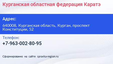 Курганская областная федерация Каратэ по адресу 640008, Курганская область, Курган, проспект Конституции, 52 в дальнейшем Организация, размещена в следующих категориях:
