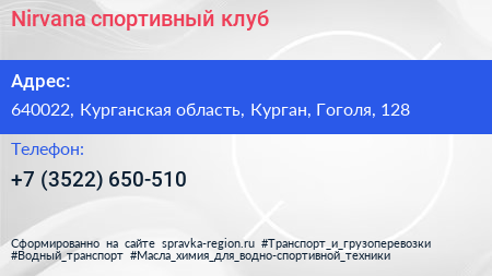 Nirvana, спортивный клуб по адресу 640022, Курганская область, Курган, Гоголя, 128 в дальнейшем Организация, размещена в следующих категориях: