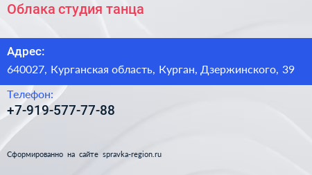 Облака, студия танца по адресу 640027, Курганская область, Курган, Дзержинского, 39 в дальнейшем Организация, размещена в следующих категориях: