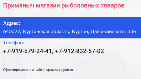 Приманыч, магазин рыболовных товаров по адресу 640027, Курганская область, Курган, Дзержинского, 33Б в дальнейшем Организация, размещена в следующих категориях: