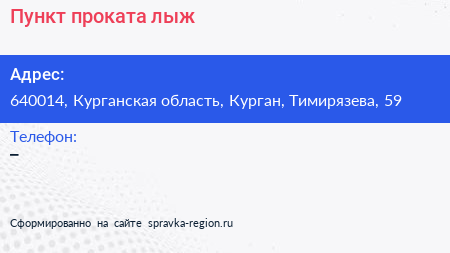 Пункт проката лыж по адресу 640014, Курганская область, Курган, Тимирязева, 59 в дальнейшем Организация, размещена в следующих категориях: