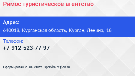 Римос, туристическое агентство по адресу 640018, Курганская область, Курган, Ленина, 18 в дальнейшем Организация, размещена в следующих категориях: