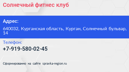Солнечный, фитнес-клуб по адресу 640032, Курганская область, Курган, Солнечный бульвар, 14 в дальнейшем Организация, размещена в следующих категориях: