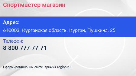 Спортмастер, магазин по адресу 640003, Курганская область, Курган, Пушкина, 25 в дальнейшем Организация, размещена в следующих категориях: