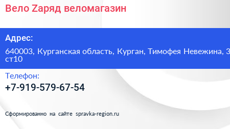 Вело Zаряд, веломагазин по адресу 640003, Курганская область, Курган, Тимофея Невежина, 3 ст10 в дальнейшем Организация, размещена в следующих категориях: