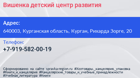 Вишенка, детский центр развития по адресу 640003, Курганская область, Курган, Рихарда Зорге, 20 в дальнейшем Организация, размещена в следующих категориях:
