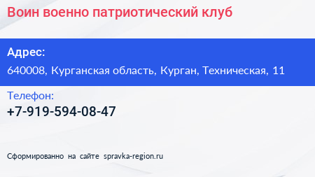 Воин, военно-патриотический клуб по адресу 640008, Курганская область, Курган, Техническая, 11 в дальнейшем Организация, размещена в следующих категориях: